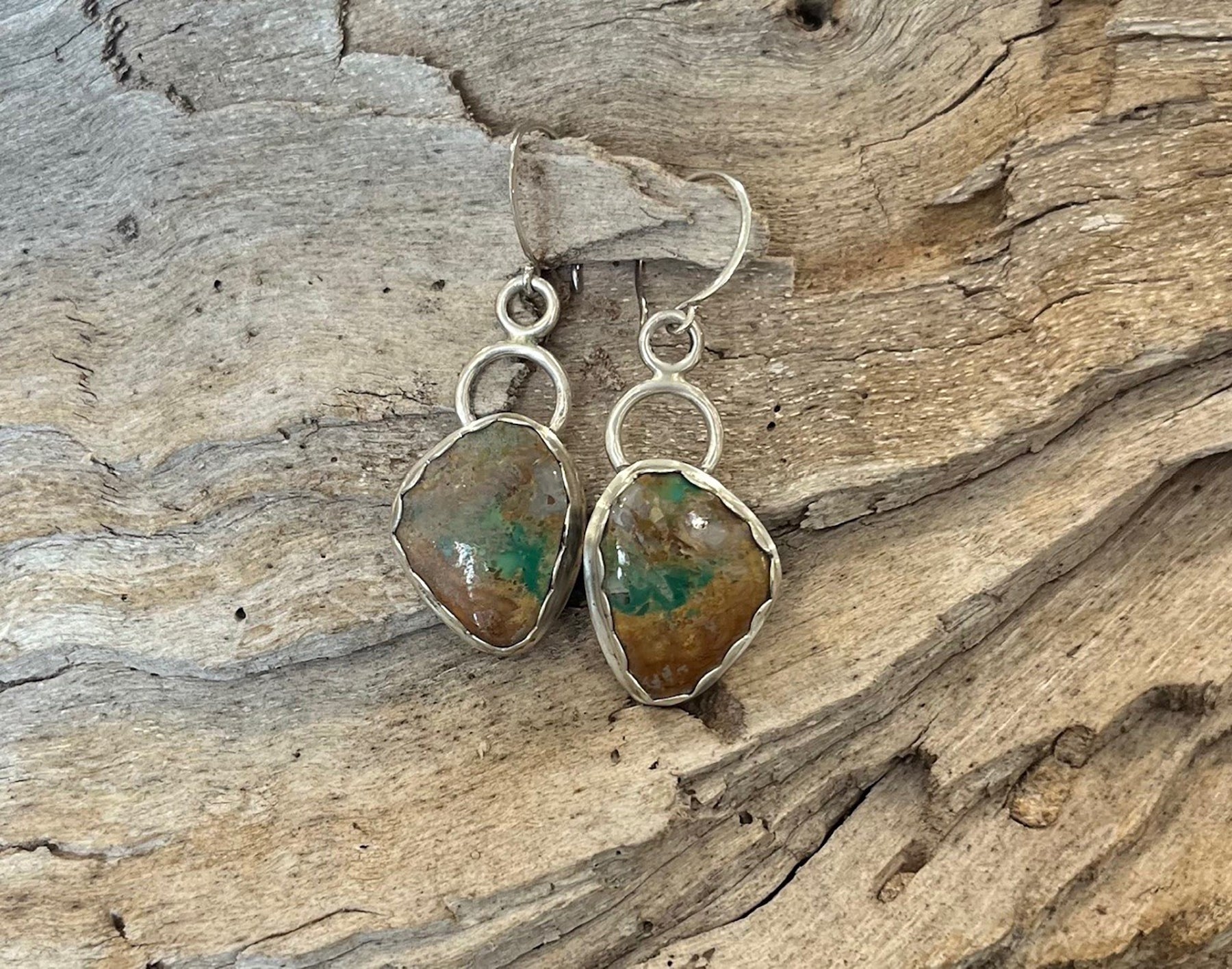 These handcrafted earrings are made from Tyrone Turquoise stones and sterling silver.