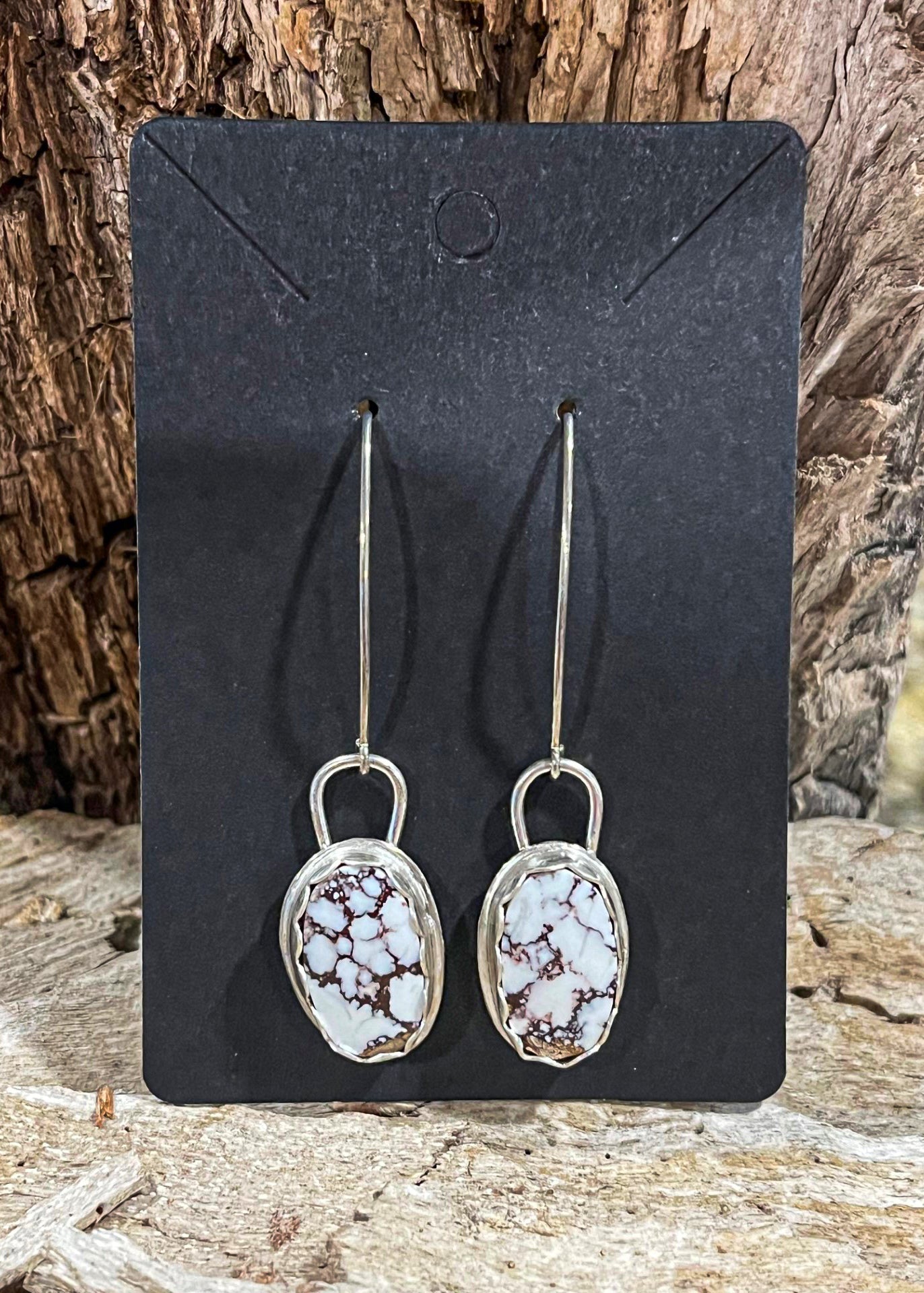 These earrings are made from Wild Horse Magnesite stones and sterling silver. Wild Horse Magnesite is a unique stone only found in the Gila Wilderness in southern Arizona. It is a very vibrant white and brown stone.